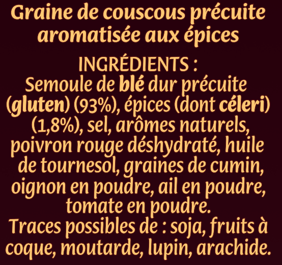 Veuillez en prendre connaissance avant toute consommation, notamment si vous présentez des risques d'allergies.ces à couscous dont la saveur évoque immédiatement l'Orient.