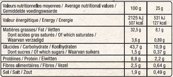 Valeurs nutritionnelles fournies à titre indicatif. Seules les valeurs nutritionnelles fournies sur l’emballage du produit font foi. Veuillez en prendre connaissance avant toute consommation.