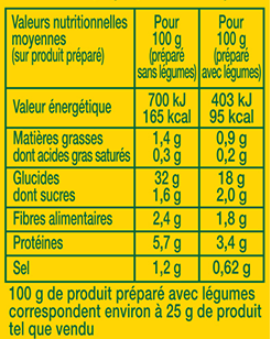 Valeurs nutritionnelles fournies à titre indicatif. Seules les valeurs nutritionnelles fournies sur l’emballage du produit font foi. Veuillez en prendre connaissance avant toute consommation.